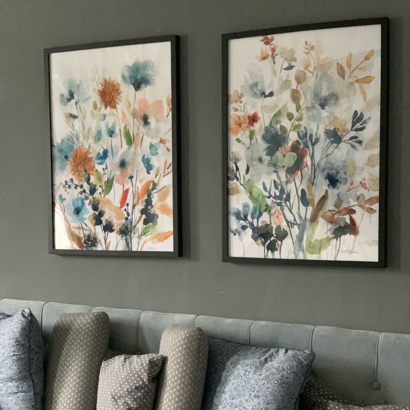 Tableau accroché au mur du salon après réfection, couleurs correspondantes au choix effectué sur le site